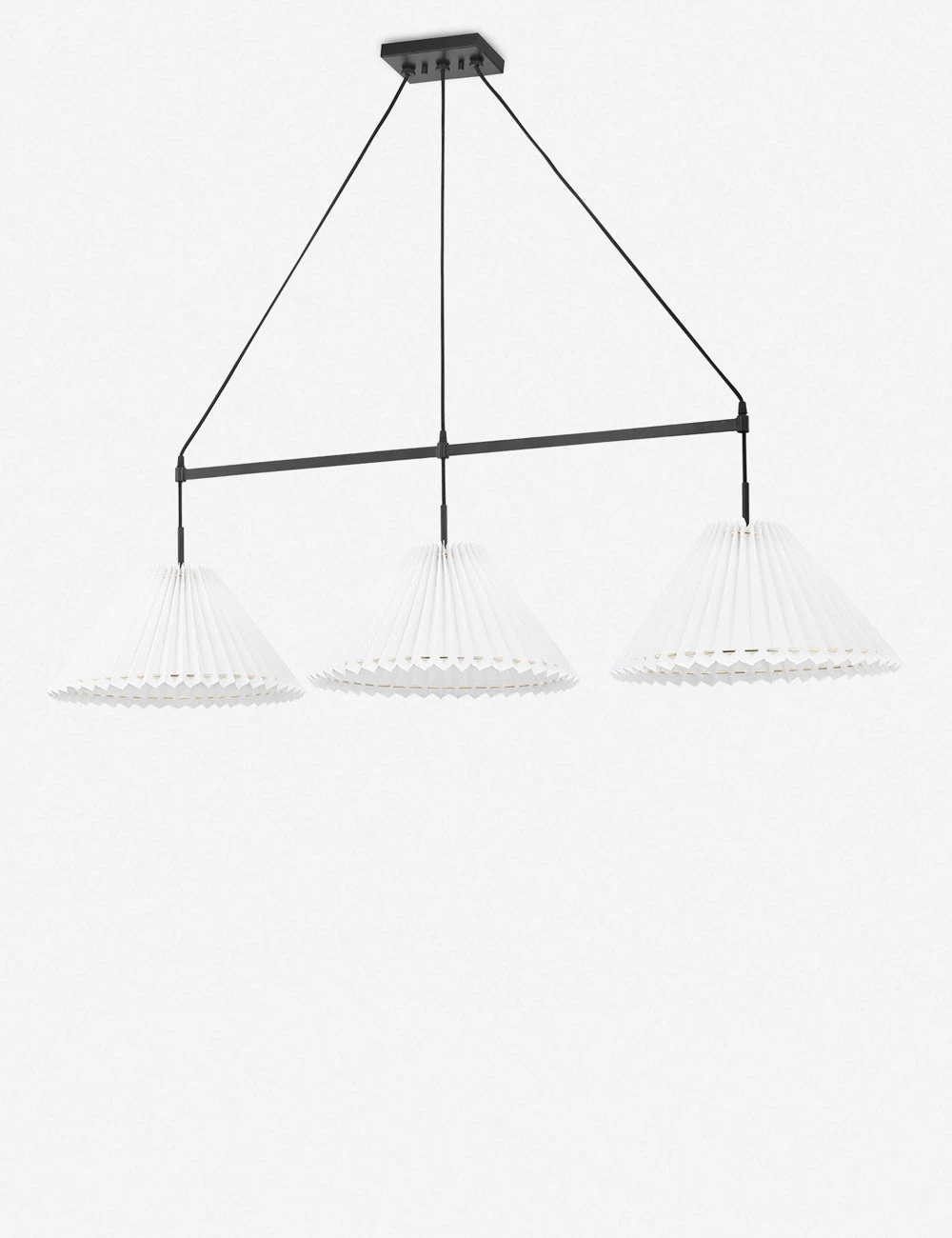 Blending timeless notes with a modern design, this pendant light features a sleek frame with pleated shades for a chicly balanced profile. Metal rings thread each pleated shade at top and bottom, adding a touch of glamour to this modern pendant. This 3-light fixture can offer task lighting above a kitchen counter or coffee table.