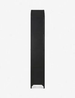 Iron sheeting is finished in a soft matte black and fitted with brass hardware for a dramatic touch in this oversized curio cabinet. Its dark backdrop, glass-paneled doors, and arched top make it the perfect cabinet for turning simple storage into a curated display. Bring a vintage air into a collected space with this subtly gothic curio cabinet.