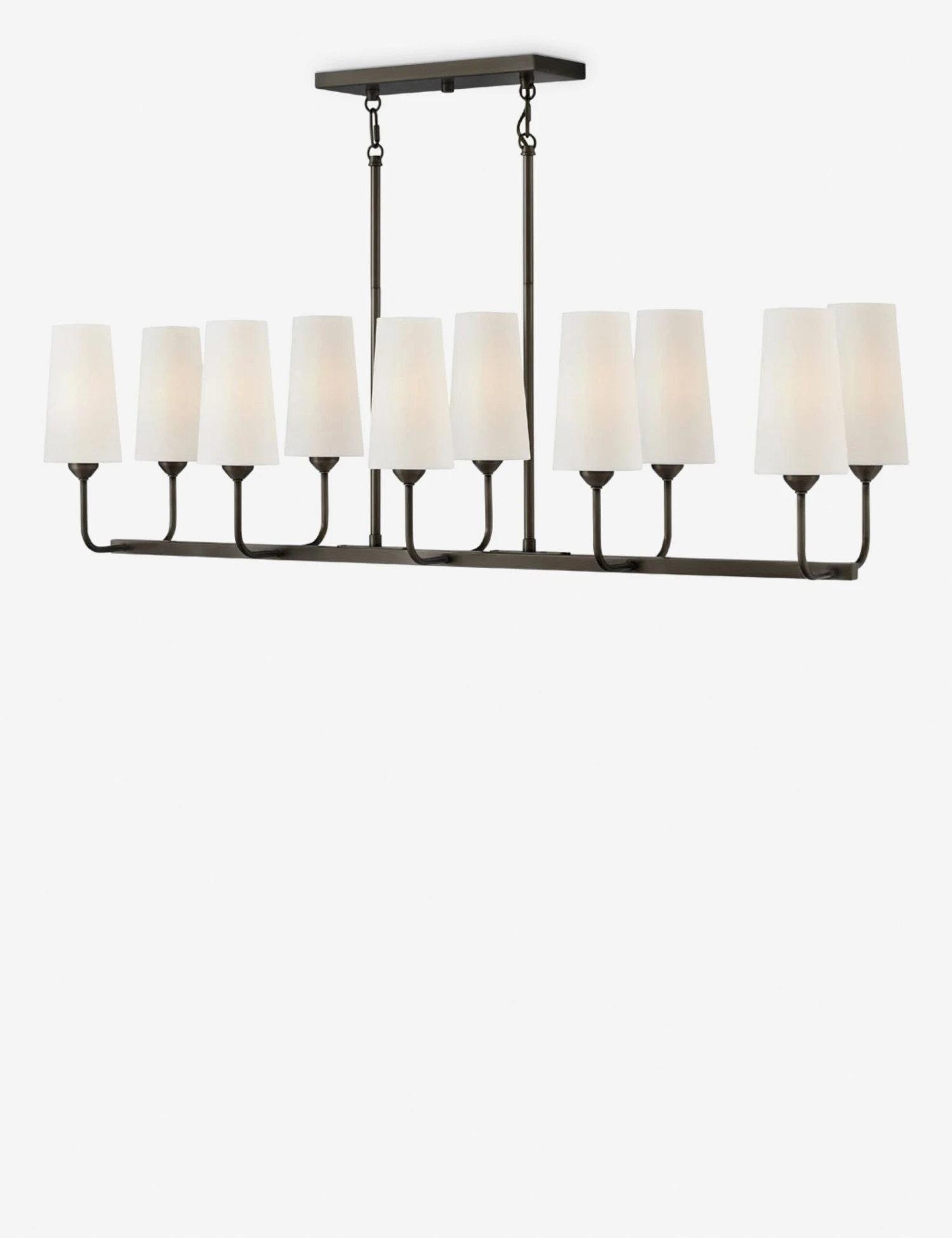 The Dabney chandelier brings stylish elegance to traditional lighting. The tapered paper shades feature fine stitching adding a delicate touch to the sleek frame. We love this transitional chandelier design for a dining room or kitchen where classic touches enrich modern decor.