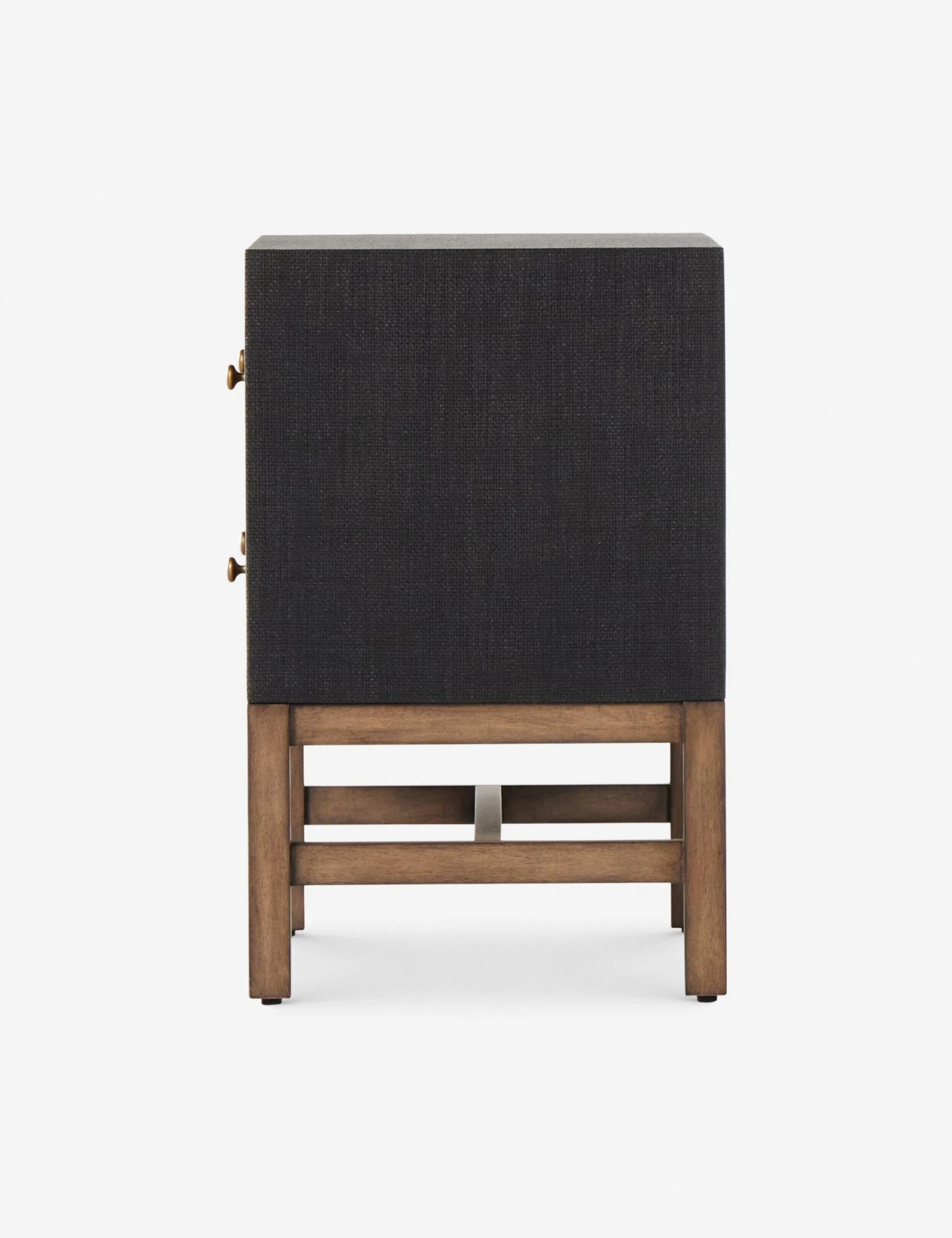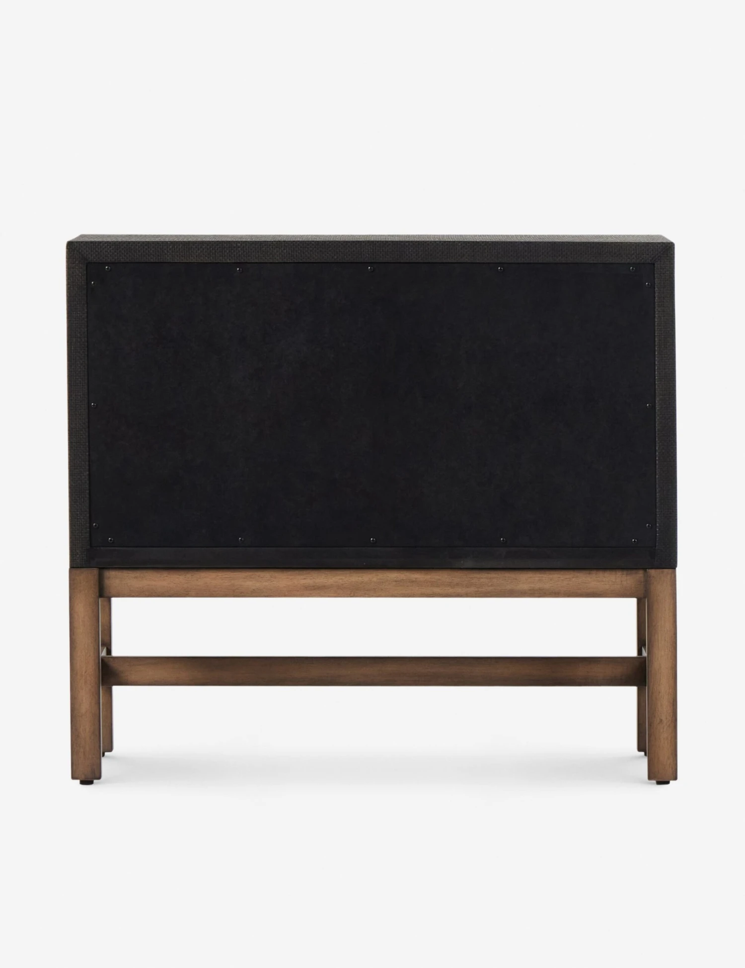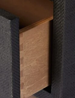 This woven raffia nightstand offers textural impact with a clean, linear silhouette. The two-tone finish of the black raffia against the warm mahogany base adds impact for a modern look and feel. Its wide profile holds two drawers for ample bedside storage.