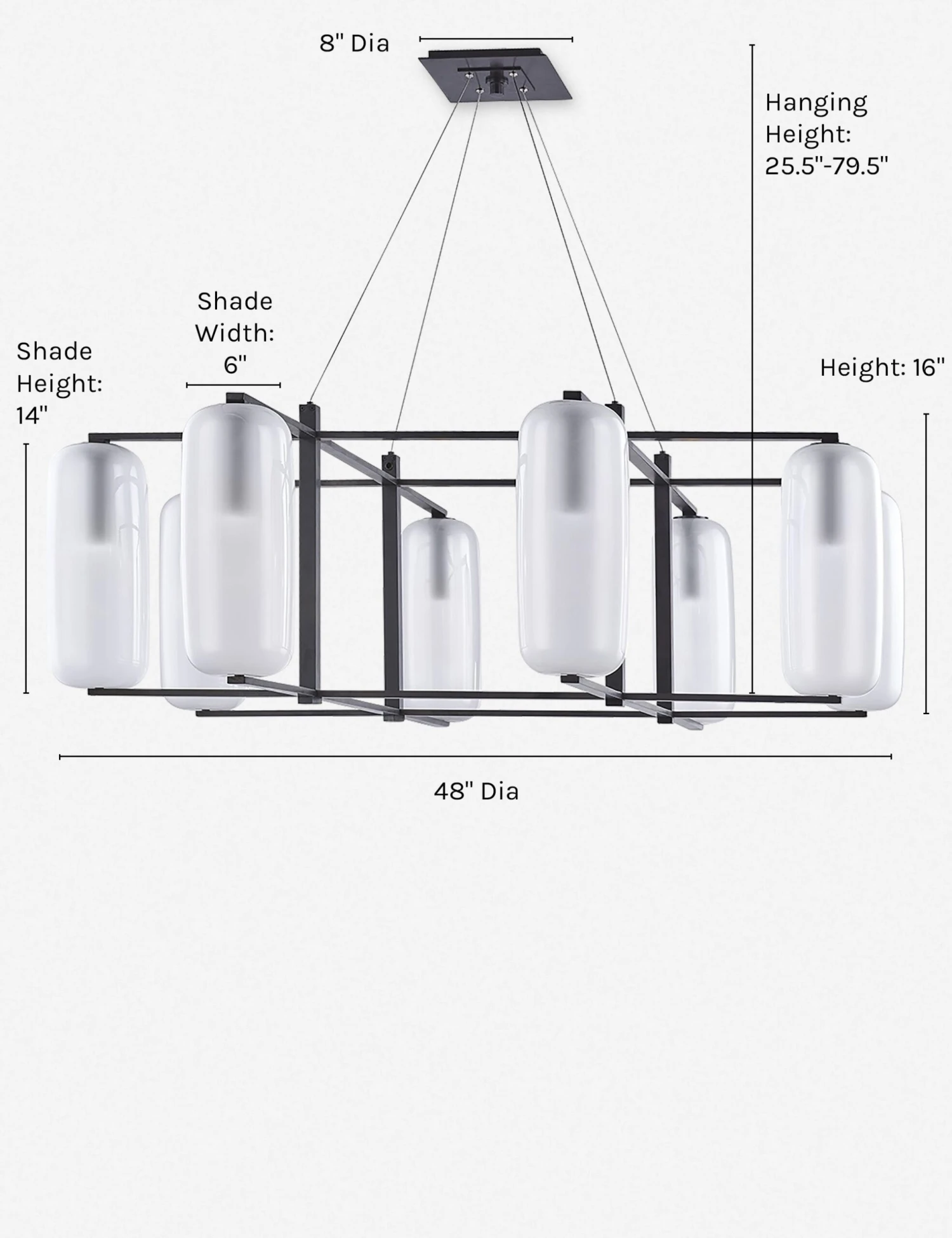 A perfectly transitional style for mid-century spaces. Four pill-shaped frosted glass shades recalls ’60s influence, while crisp lines give the entire look a more modern appeal. Our stylists recommend hanging this pendant above dining room tables, kitchen islands, or in entryways.