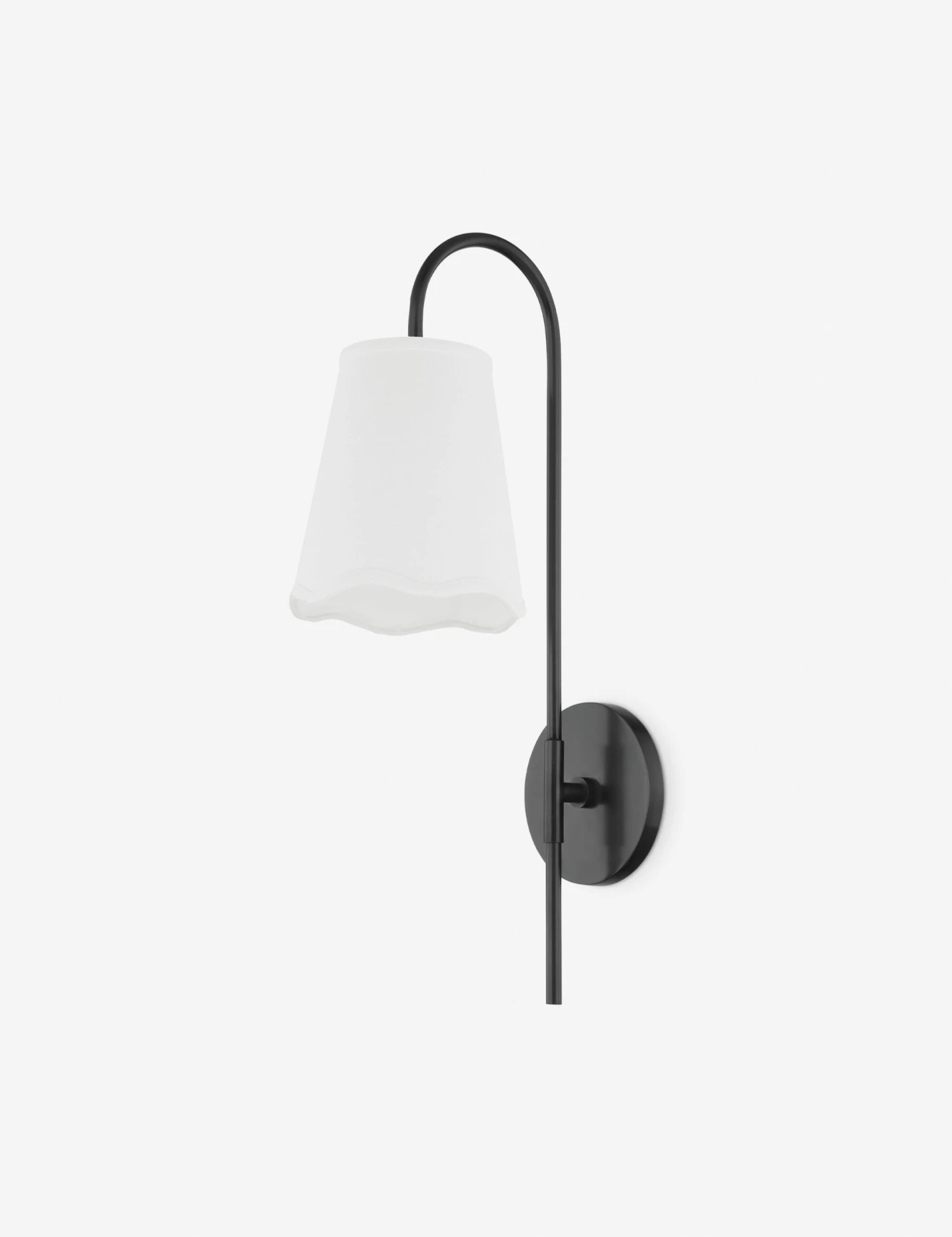 Traditional notes blend with a playful elegance in the Jessica sconce. The metal arm takes a swanlike line into a white linen shade with a wavy edge for a subtle floral charm. We love this wall sconce styled in pairs for elevated lighting in a transitional home design.