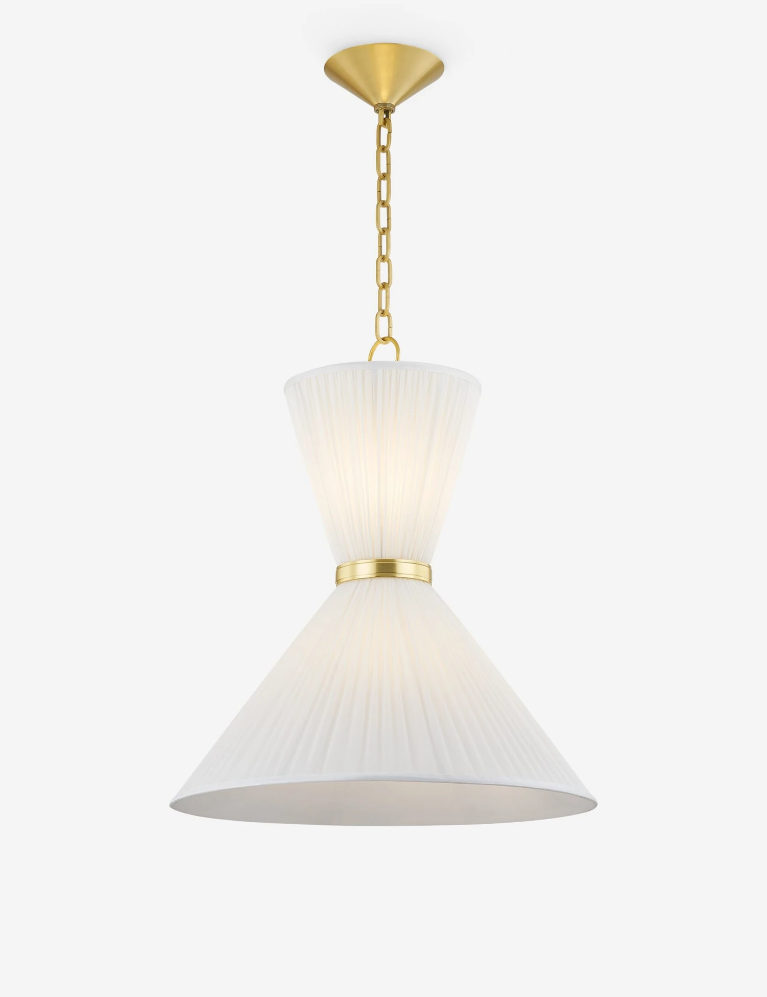 With its crisp linen shade gathered into a ruffled hourglass, the Latsko pendant has a fresh elegance about it. This chic hanging light fixture is suspended by a chain with matching metal accents for that perfect touch of polish overhead.