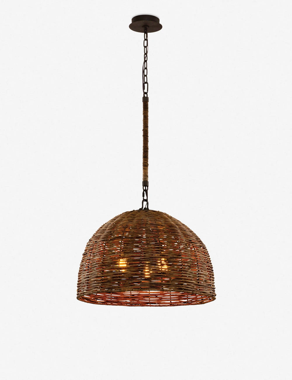 A basket woven shade brings fresh texture with a laid-back air to the Macias chandelier. This hanging wicker light fixture can offer a warm rustic feature over a dining room table or signature piece in a thoughtfully collected lounge.