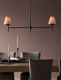 The Marisol chandelier bends traditional notes in a modern design to offer the perfect lighting element for transitional decor. A black finish accentuates the slim iron frame, with tapered beige shades for an elegant touch. This linear chandelier is the perfect way to bring understated impact to a kitchen island or dining table.