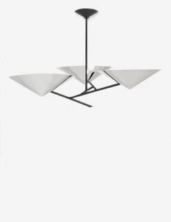 Give your space a harmonious glow with the addition of this stunning chandelier. Drawing from Eastern influence, three round, metal shades diffuse light upwards, with a cutout design to show off the chic, intersecting hardware.