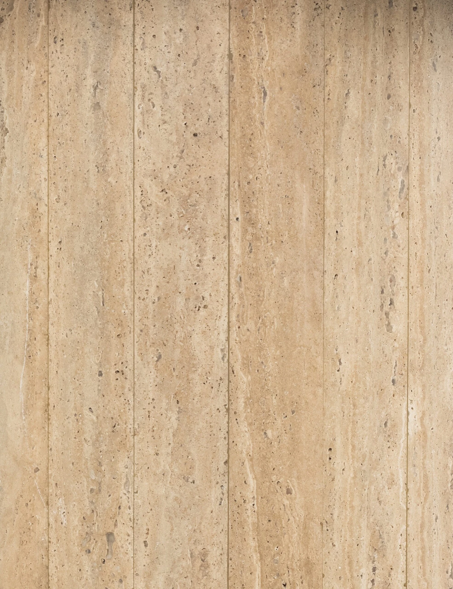Sculptural appeal abounds in this mixed-material dining table. Featuring a natural oak tabletop and chunky, columnar legs made from solid travertine, this table offers a rich organic contrast with retro notes in a modern design.