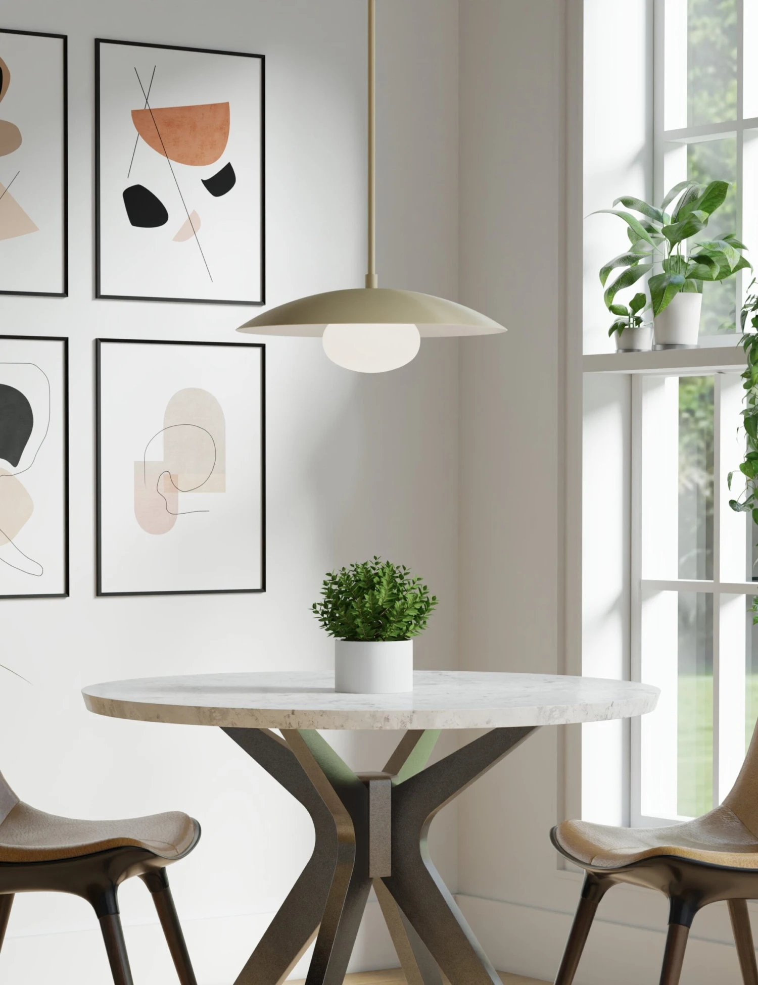 Strike a modern tone in any space with the Shah pendant light. Its sleek, sculptural form features a slim stem suspending a shallow shade over a frosted glass globe. We love this pendant light for layering bright ambient light overhead with a minimalist feel.