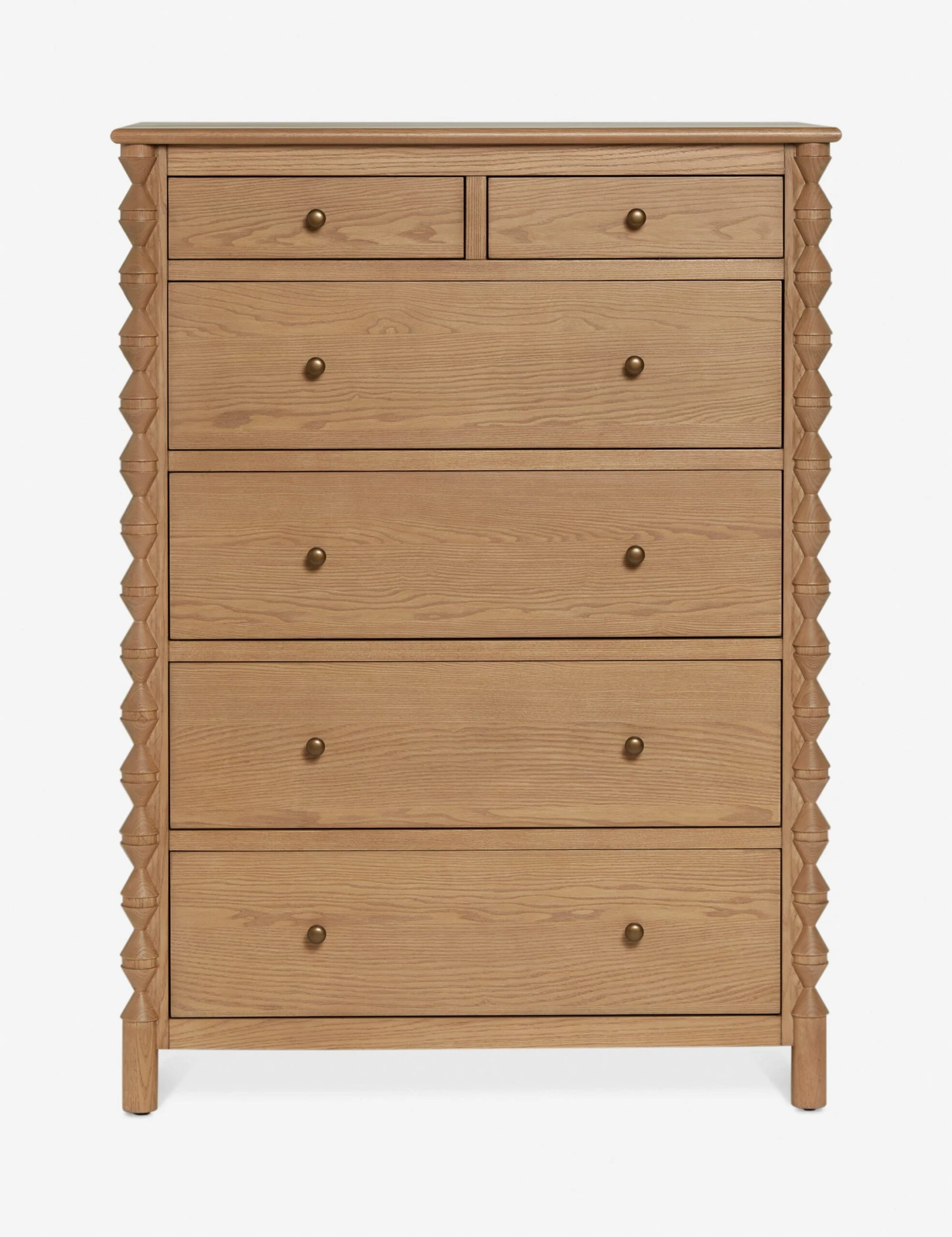 Spacious bedroom storage gets a compact footprint in this tall dresser from the exclusive Ginny Macdonald collection for Lulu and Georgia. Inspired by Ginny’s English heritage and fondness for handcrafted details, each piece in the collection fuses her British roots with her California lifestyle. Turned legs add a touch of drama to a tallboy design made from ash wood.